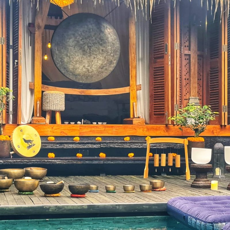 Embark on a transformative sound healing journey in a serene jungle setting, featuring singing bowls, gongs, and a maximum of 11 participants, facilitating deep relaxation and chakra alignment.